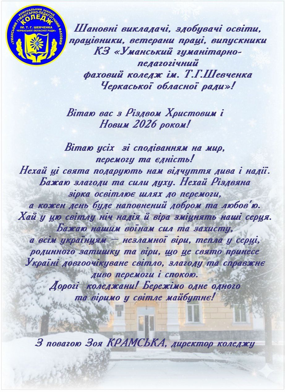 Шановні працівники та студенти КЗ "Уманський гуманітарнно-педагогічний фаховий коледж ім. Т. Г. Шевченка Черкаської обласної ради"! Наслідки ракетного удару по Умані 26 грудня 2025 року складні.