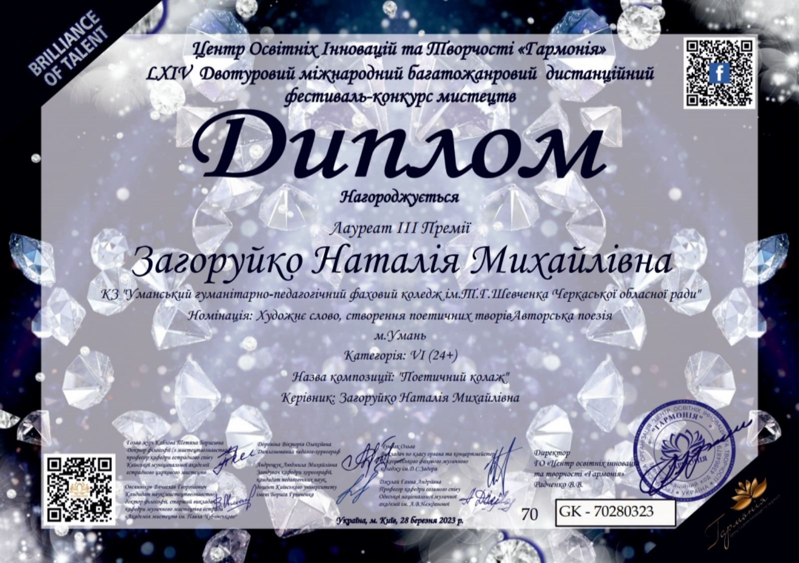 Викладач української мови і літератури, зарубіжної літератури Загоруйко Наталія Михайлівна (комісія української мови і літератури з методикою навчання, голова кандидат філологічних наук Денисюк Тетяна Костянтинівна) взяла участь у LXIV Двотуровому міжнародному багатожанровому дистанційному фестивалі-конкурсі мистецтв "BRILLIANCE OF TALENT" та стала Лауреатом ІІІ Премії у номінації Художнє слово, створення поетичних творів. Авторська поезія.