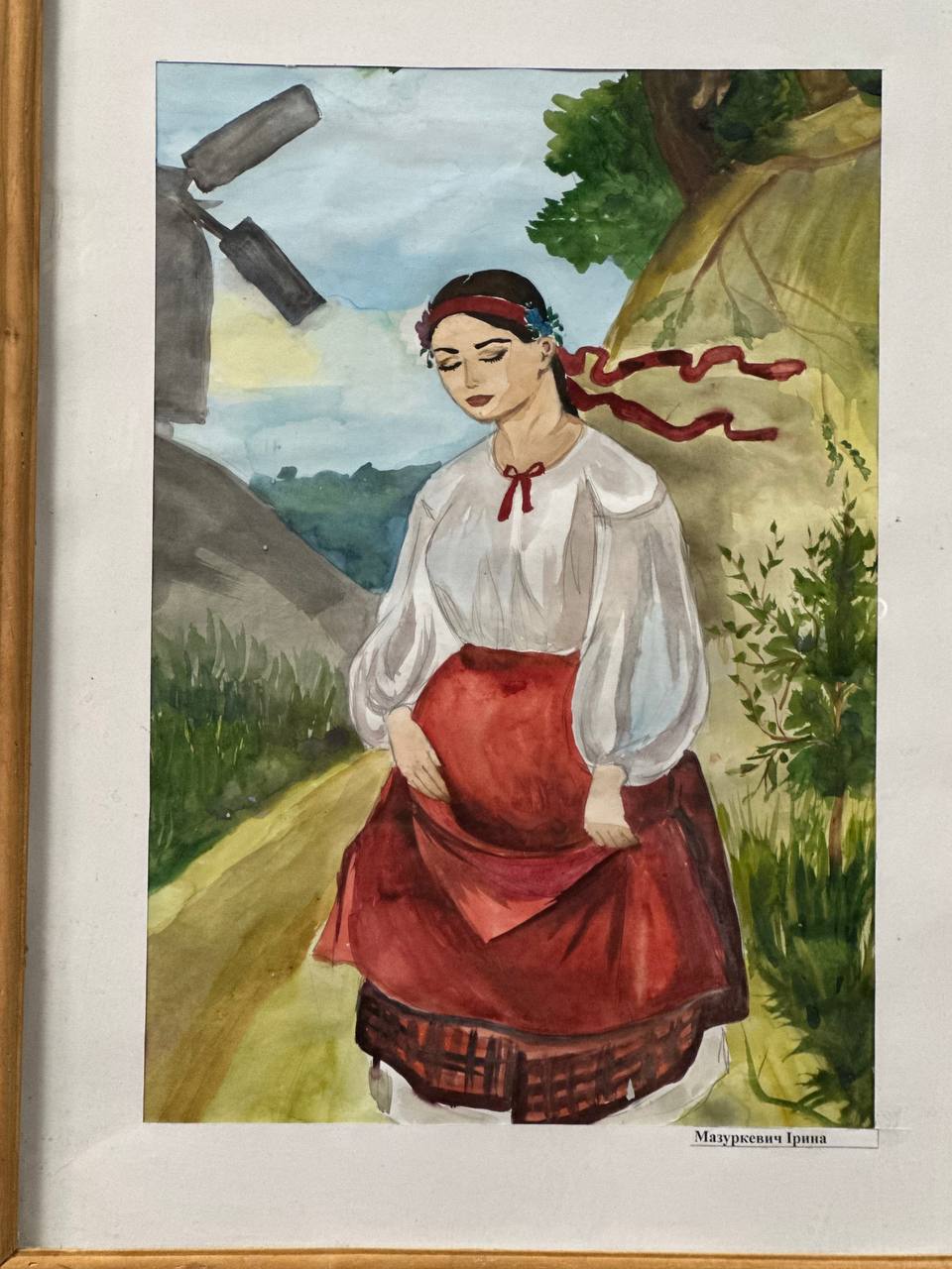 У першій роботі постає задумлива постать дівчини на тлі рідного краю — її схилена голова, стриманий погляд і червона хустка, що розвівається вітром, передають внутрішній біль і водночас гідність. Пейзаж довкола — це не просто тло, а живий свідок людської долі, символ України, яка співчуває й оберігає.