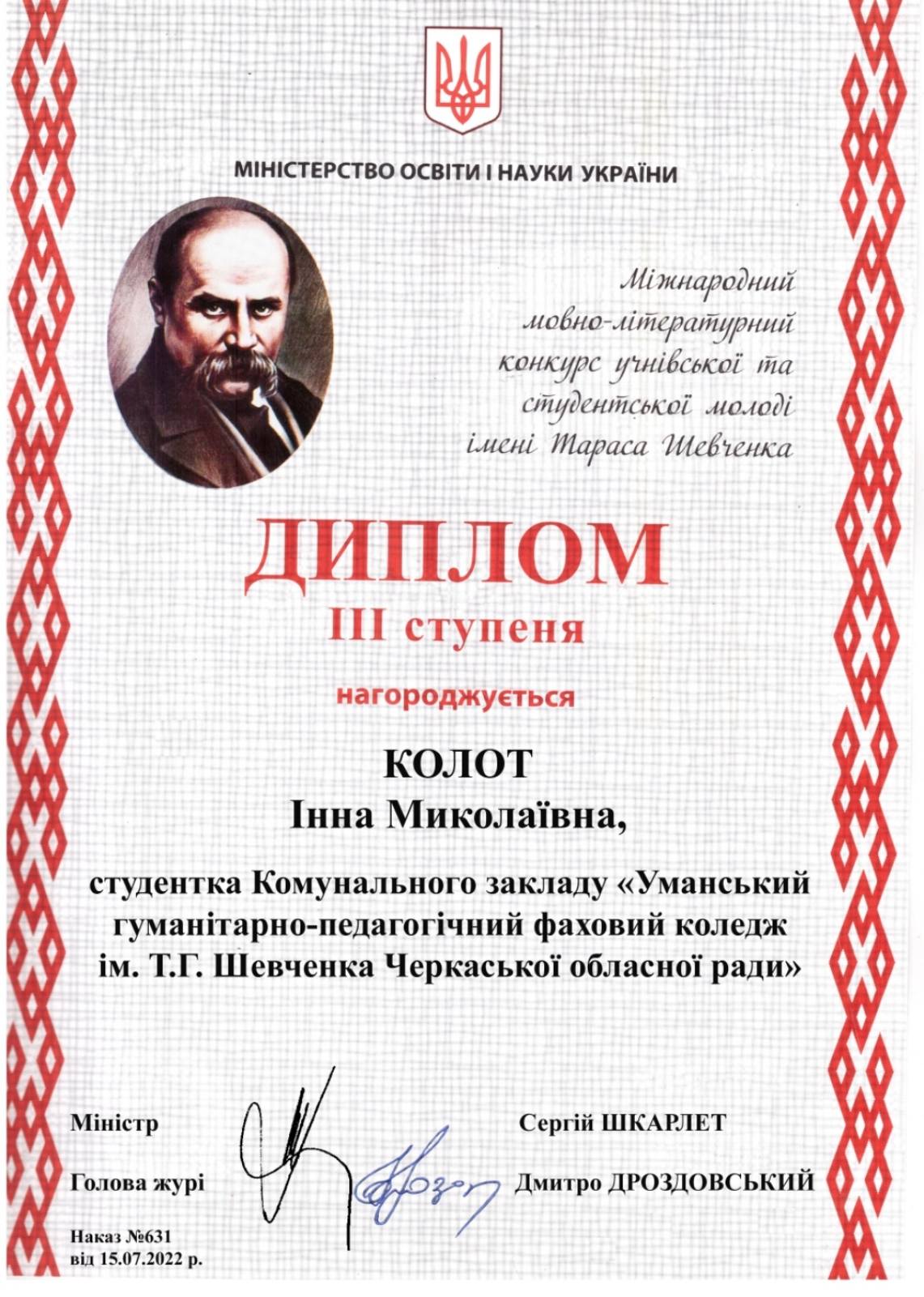 Вітаємо Інну КОЛОТ, здобувачку освіти 202-П групи відділення дошкільної і початкової освіти спеціальності 013 Початкова освіта КЗ "Уманський гуманітарно-педагогічний фаховий коледж ім. Т.Г.Шевченка Черкаської обласної ради ", з отриманим Дипломом ІІІ ступеня у всеукраїнському турі Міжнародного мовно-літературного конкурсу учнівської та студентської молоді імені Тараса Шевченка та викладача української мови і літератури коледжу, викладача вищої кваліфікаційної категорії Войтенко Г.М.