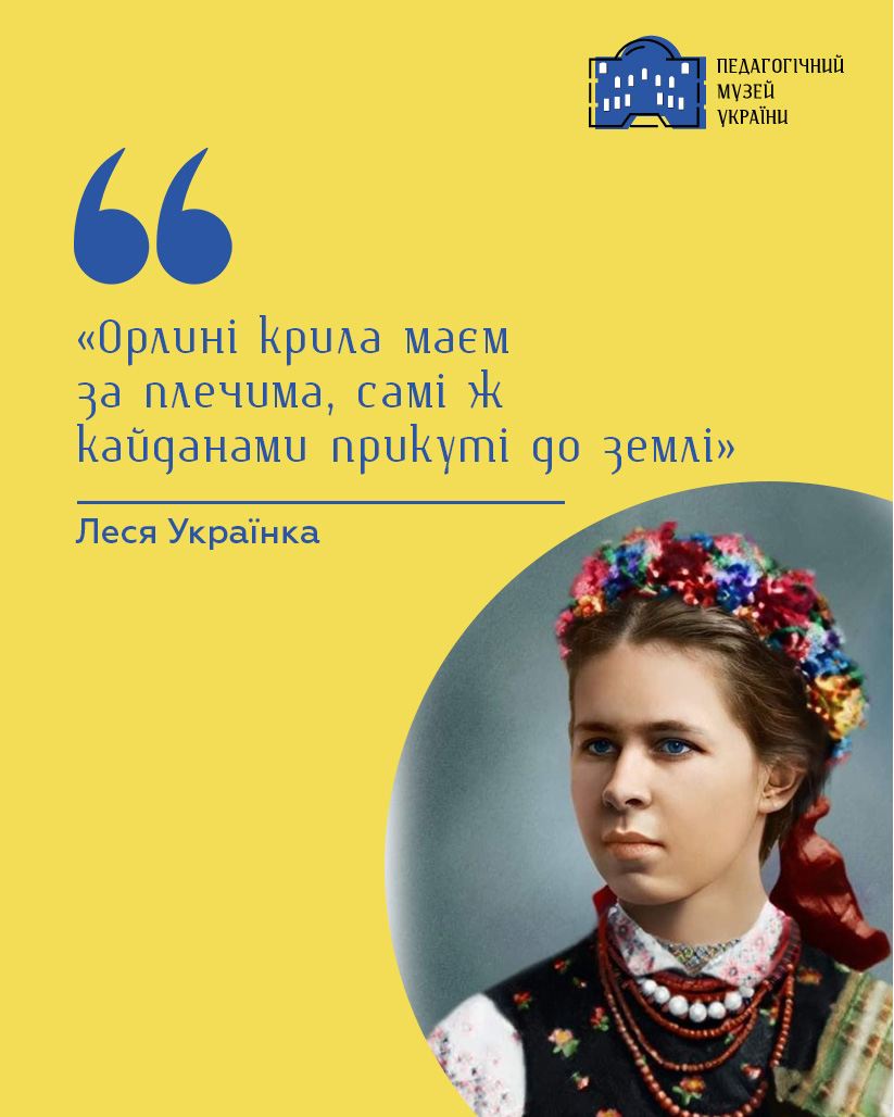 Педагогічний музей України. Леся Українка Написано 25 лютого 2023. #ЛесяУкраїнка #Цитата_від_Музи_Педагогіки Фото в кольорі: Fix_you_pics Перегляди: 448 Попередня Наступна
