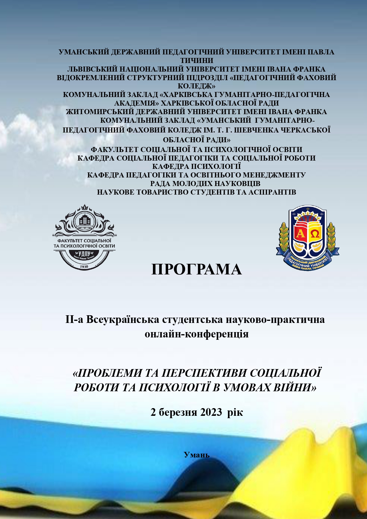 Участь у ІІ Всеукраїнській студентській науково-практичній онлайн-конференції «ПРОБЛЕМИ ТА ПЕРСПЕКТИВИ СОЦІАЛЬНОЇ РОБОТИ ТА ПСИХОЛОГІЇ В УМОВАХ ВІЙНИ»