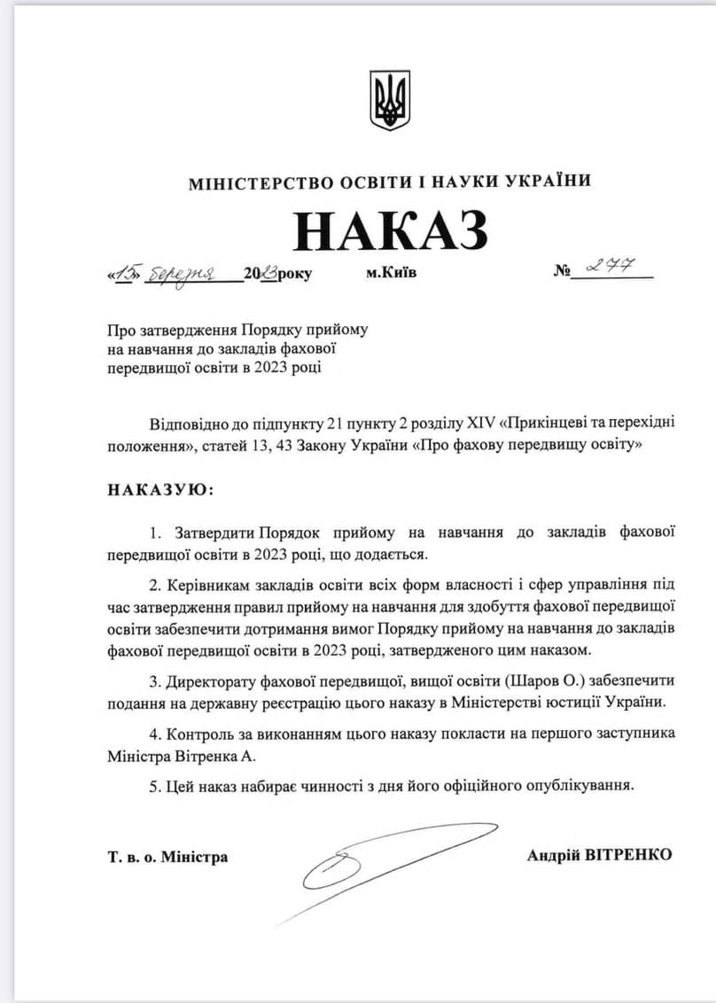 ТЕКСТ ПОРЯДКУ ПРИЙОМУ НА НАВЧАННЯ ДО ЗАКЛАДIВ ФАХОВОÏ ПЕРЕДВИЩОÏ ОСВIТИ У 2023 РОЦI Написано 19 березня 2023. HTTPS://MON.GOV.UA/.../NAKAZ.MON.%20277.VID.15-03-2023.PDF Перегляди: 414 Попередня Наступна