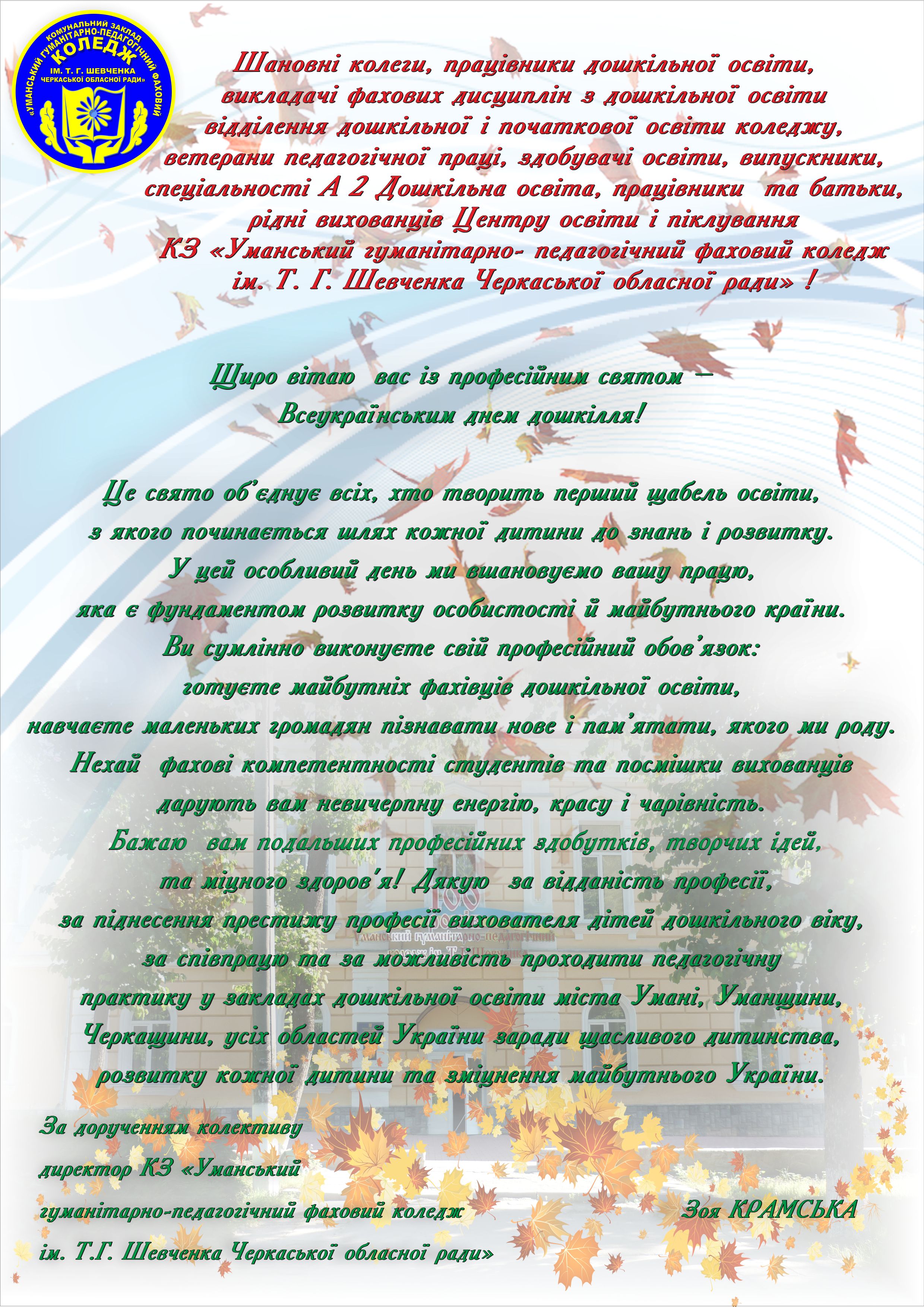 Пісня про осінь у виконанні Олівії Сьоміної. Навчальна лабораторія "Центр освіти і піклування про дітей дошкільного віку" КЗ "Уманський гуманітарно-педагогічний фаховий коледж ім. Т. Г. Шевченка Черкаської обласної ради". Детальніше