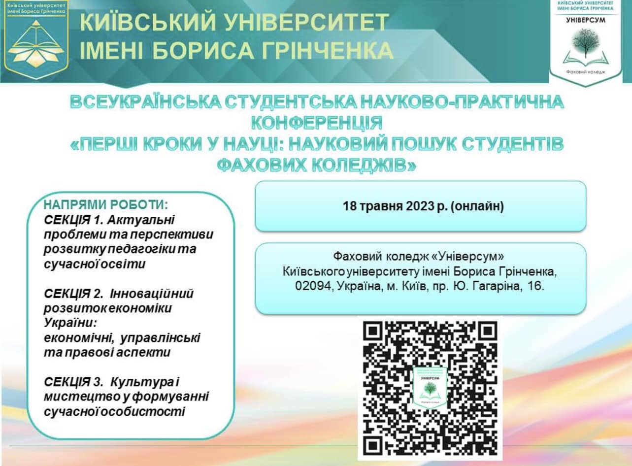 Київський університет імені Бориса Грінченка запрошує 18 травня 2023 року взяти участь у Всеукраїнській студентській науково-практичній онлайн-конференції «ПЕРШІ КРОКИ У НАУЦІ: НАУКОВИЙ ПОШУК СТУДЕНТІВ ФАХОВИХ КОЛЕДЖІВ». Детальніше