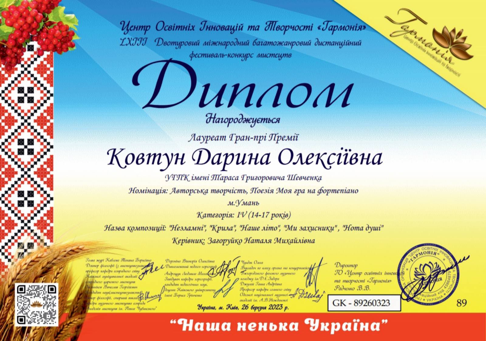 Здобувач освіти 203-ПМ групи Комунального закладу "Уманський гуманітарно-педагогічний фаховий коледж ім. Т. Г. Шевченка Черкаської обласної ради" Ковтун Дарина Олексіївна взяла участь у XLIII Двотуровому міжнародному багатожанровому дистанційному фестивалі-конкурсі мистецтв "Наша ненька Україна" (Центр Освітніх Інновацій та Творчості "Гармонія") та стала Лауреатом премії Гран-прі у номінації: Авторська творчість. Поезія. Моя гра на фортепіано.