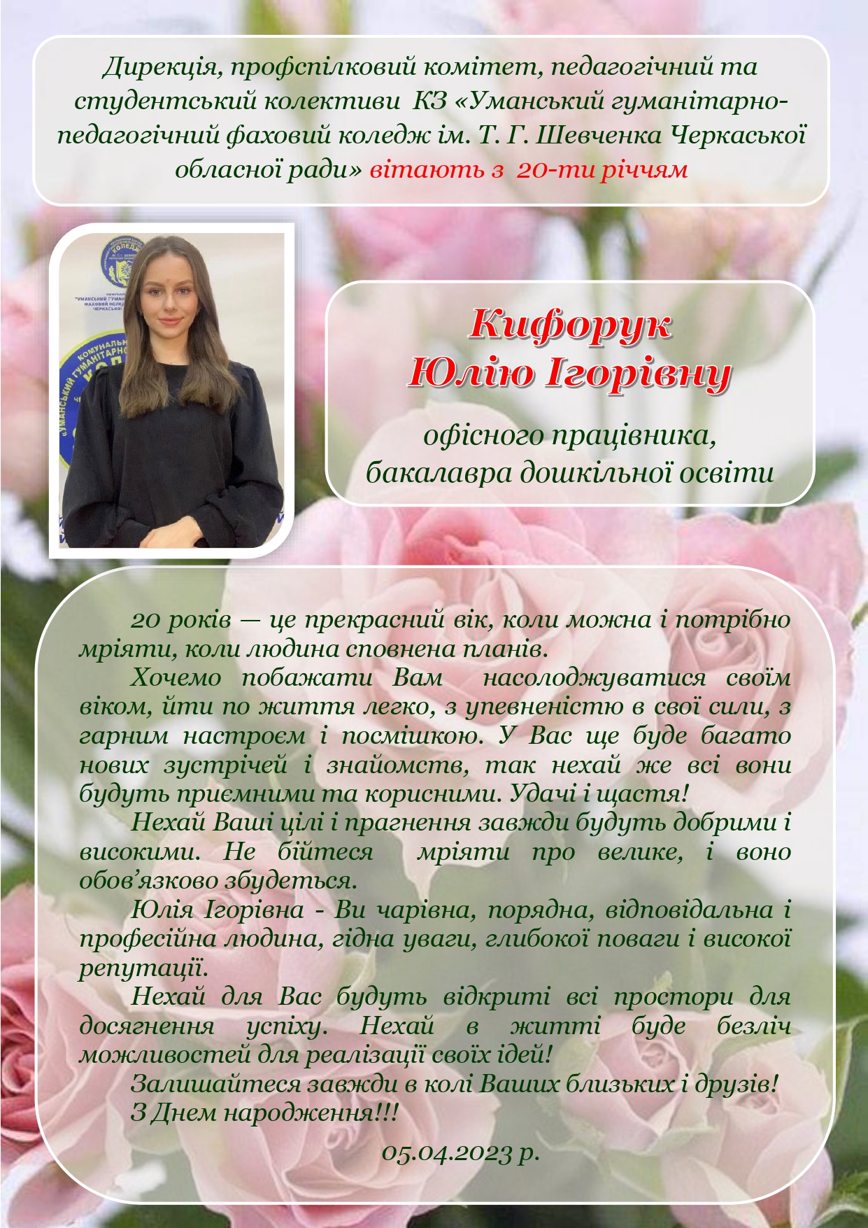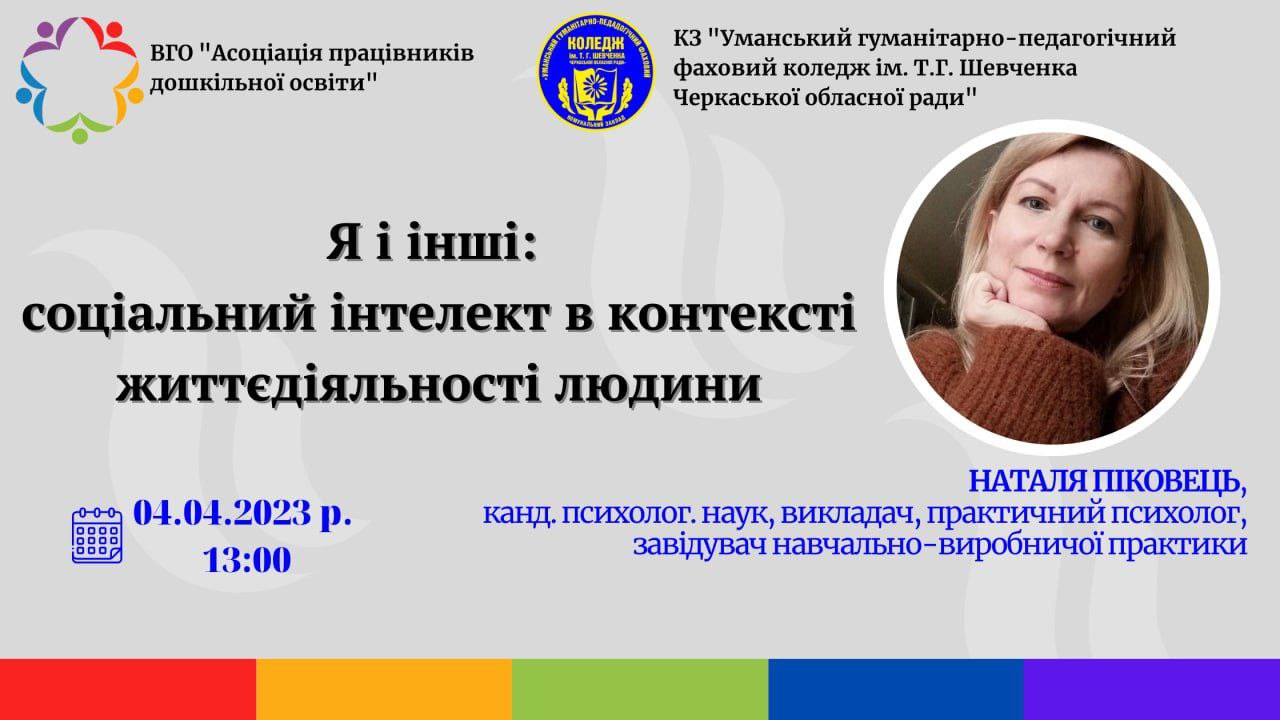 4 квітня 2023 р. у КЗ "Уманський гуманітарно-педагогічний фаховий коледж ім. Т.Г. Шевченка Черкаської обласної ради" було проведено вебінар «Я і інші: соціальний інтелект в контексті життєдіяльності людини» для членів ВГО «Асоціація працівників дошкільної освіти».