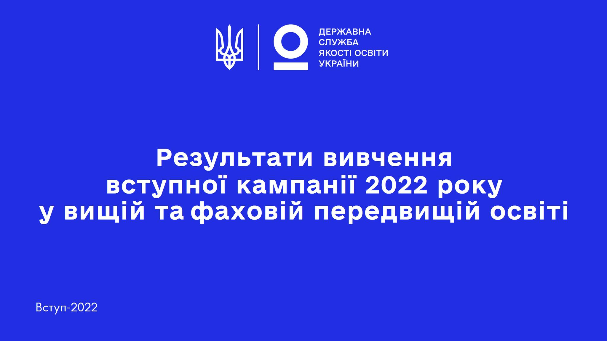 Державна служба якості освіти здійснила вивчення організації і проведення вступної кампанії закладами фахової передвищої та вищої освіти, їхніми відокремленими структурними підрозділами у 2022 році з урахуванням умов дії воєнного стану на території України. Детальніше