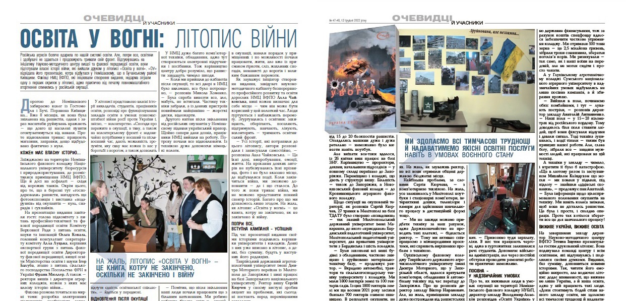 Російська агресія боляче вдарила по нашій системі освіти. Але, попри все, освітяни і здобувачі не здаються і продовжують тримати свій фронт. Відгукнувшись на ініціативу Науково-методичного центру вищої та фахової передвищої освіти, вони підготували власні історії війни, які вийшли друком у літописі «Освіта у вогні». Детальніше