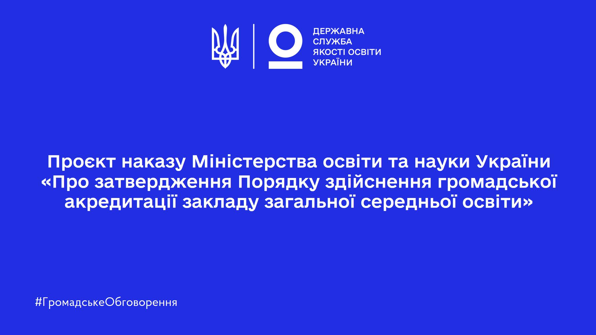 Громадське обговорення проєкту наказу Міністерства освіти та науки України «Про затвердження Порядку здійснення громадської акредитації закладу загальної середньої освіти». Детальніше