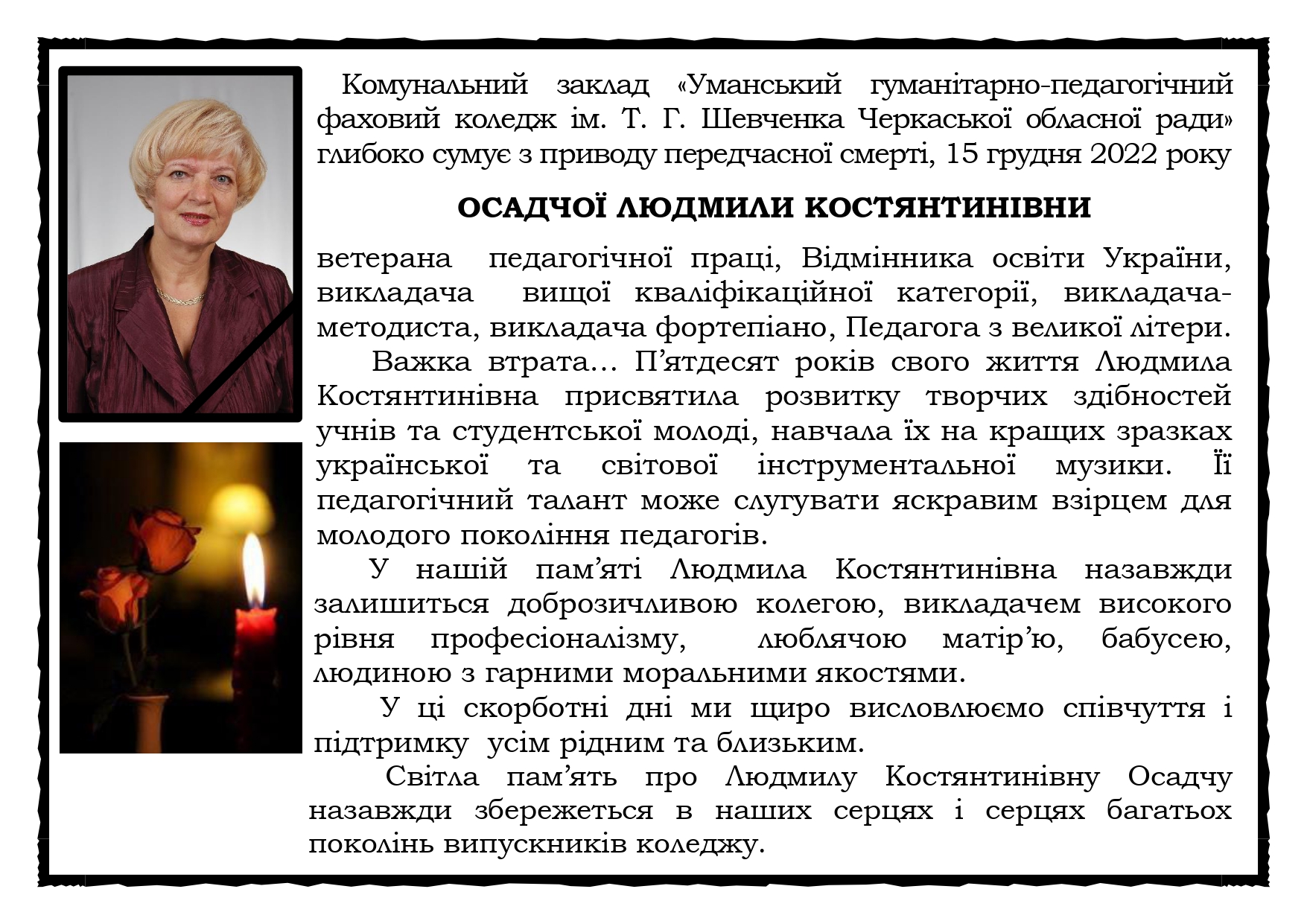 13 грудня у КЗ «Уманський гуманітарно-педагогічний фаховий коледж ім. Т.Г. Шевченка Черкаської обласної ради» відбувся семінар-практикум для науковців, педагогів, вихователів закладів дошкільної освіти, вчителів закладів загальної середньої освіти, здобувачів освіти «Роль спадщини Григорія Сковороди у формуванні духовного коду України" з нагоди 300-річчя від дня народження видатного українського педагога, поета, філософа, богослова. Детальніше