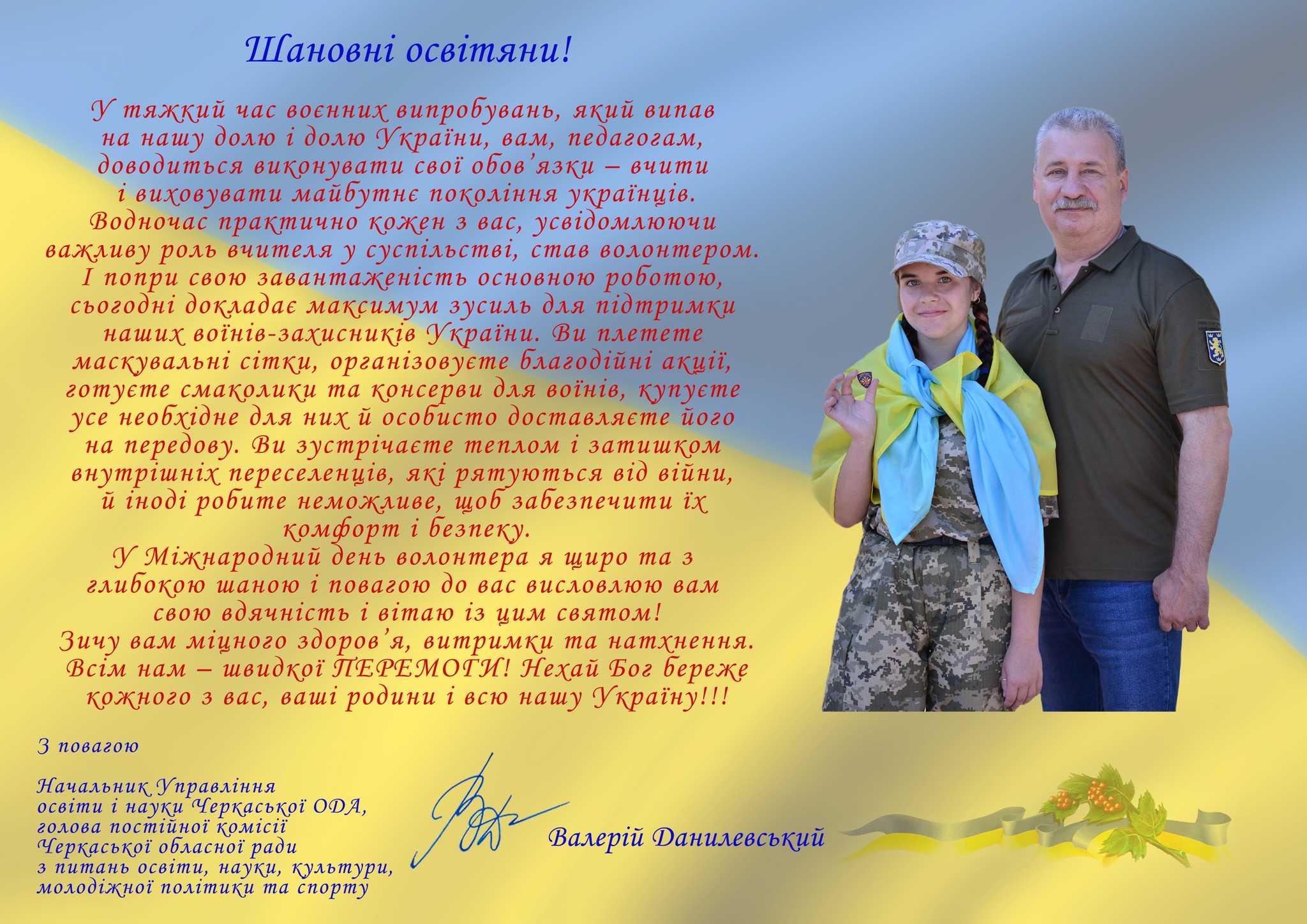 Шановну Малахову Олену Григорівну, керівника волонтерського загону «Відкриті серця» КЗ «Уманський гуманітарно-педагогічний фаховий коледж ім. Т. Г. Шевченка Черкаської обласної ради» та усіх його членів вітаємо з Міжнародним днем волонтера! Дякую за жертвенну участь у підтримці ЗСУ та усіх, хто потребує допомоги!!!! Все буде Україна! Слава Україні! Героям Слава! Детальніше