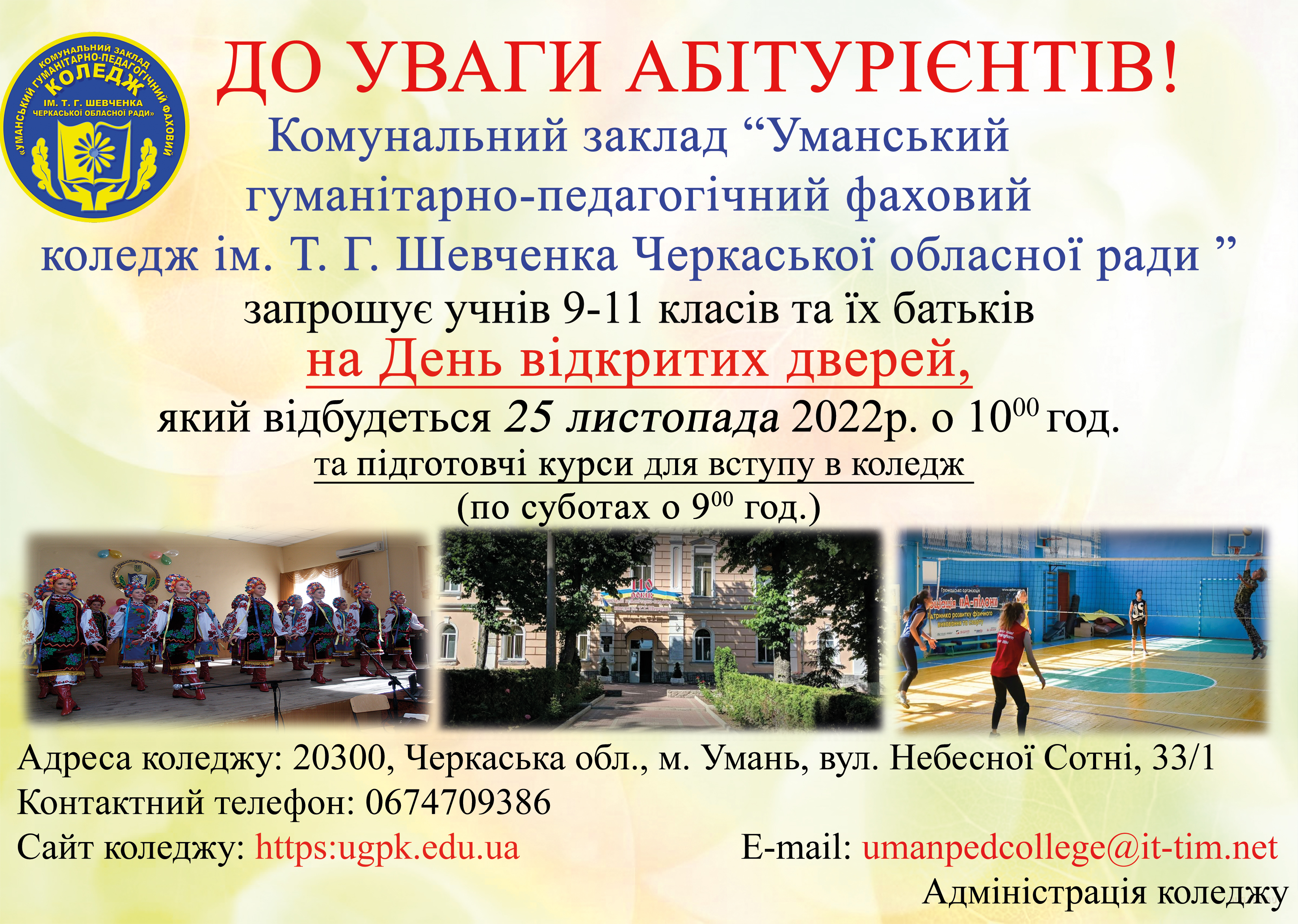 Шановні колеги, студенти та усі співробітники КЗ «Уманський гуманітарно- педагогічний фаховий коледж ім. Т. Г. Шевченка Черкаської обласної ради»!