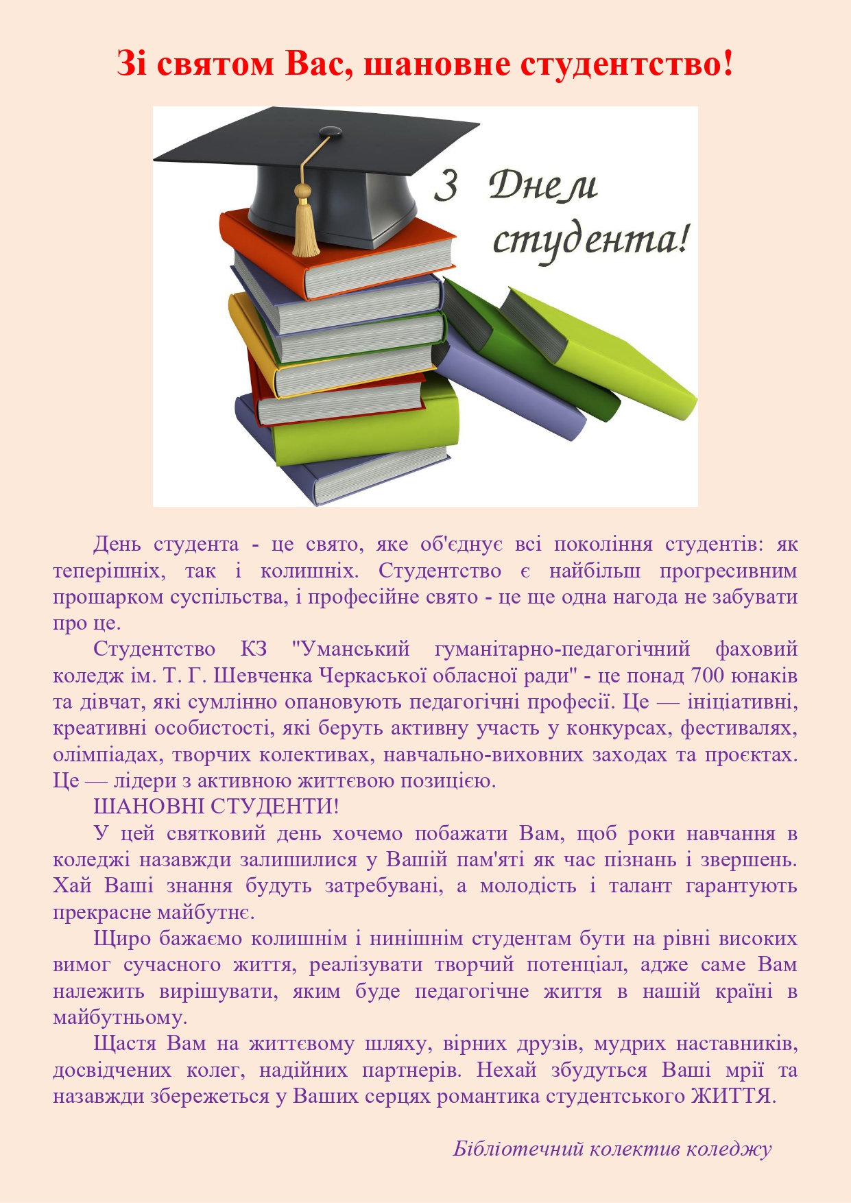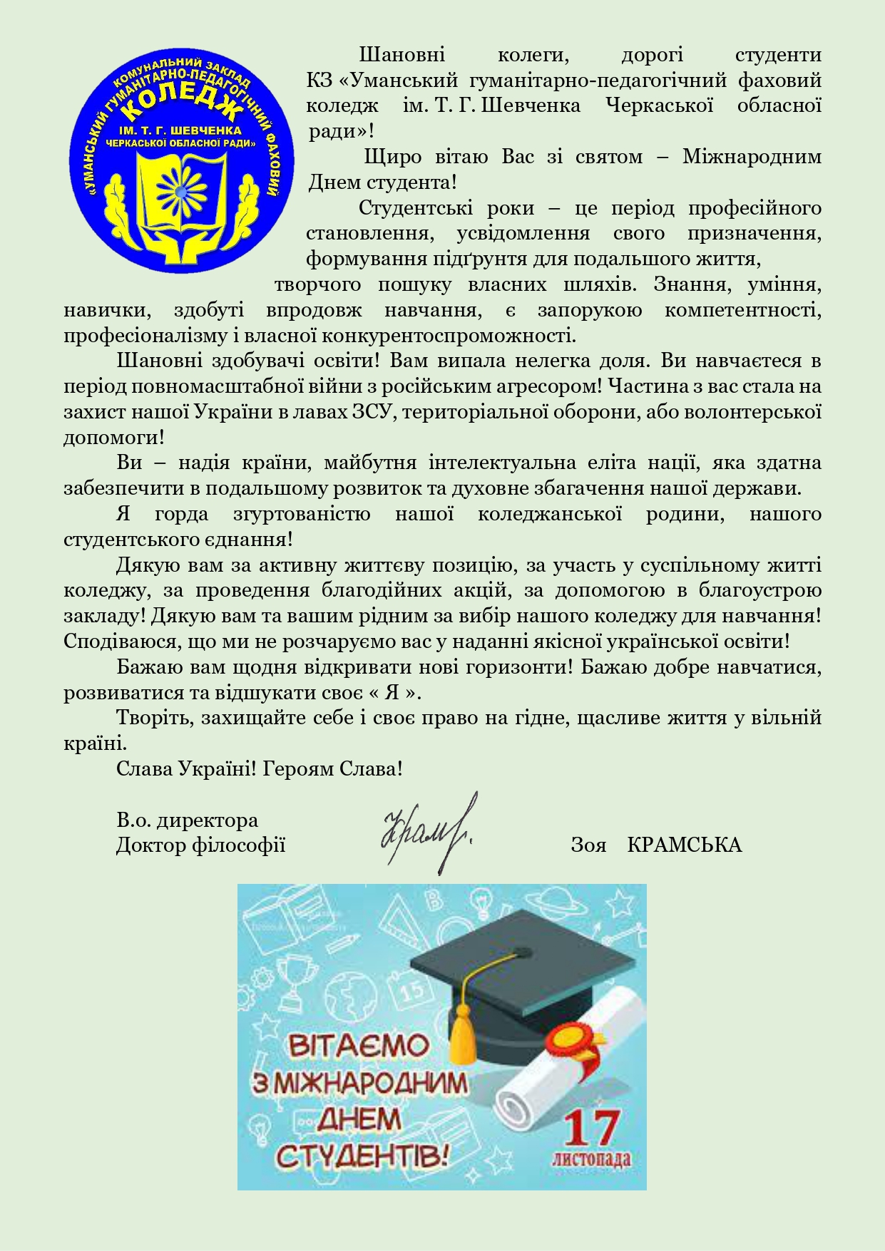 16 листопада 2022 року напередодні Міжнародного дня студента викладачі та студентська молодь КЗ «Уманський гуманітарно-педагогічний фаховий коледж ім. Т. Г. Шевченка Черкаської обласної ради» взяли участь у проведенні відкритого онлайн-діалогу з Вадимом Колесніковим, психологом, бізнес-консультантом, ведучим ТВ та радіопрограм, автором психологічних бізнес-тренінгів особистісного розвитку на тему «Психологічна готовність студентської молоді до професійної діяльності та кар’єрне становлення в умовах сучасних викликів».