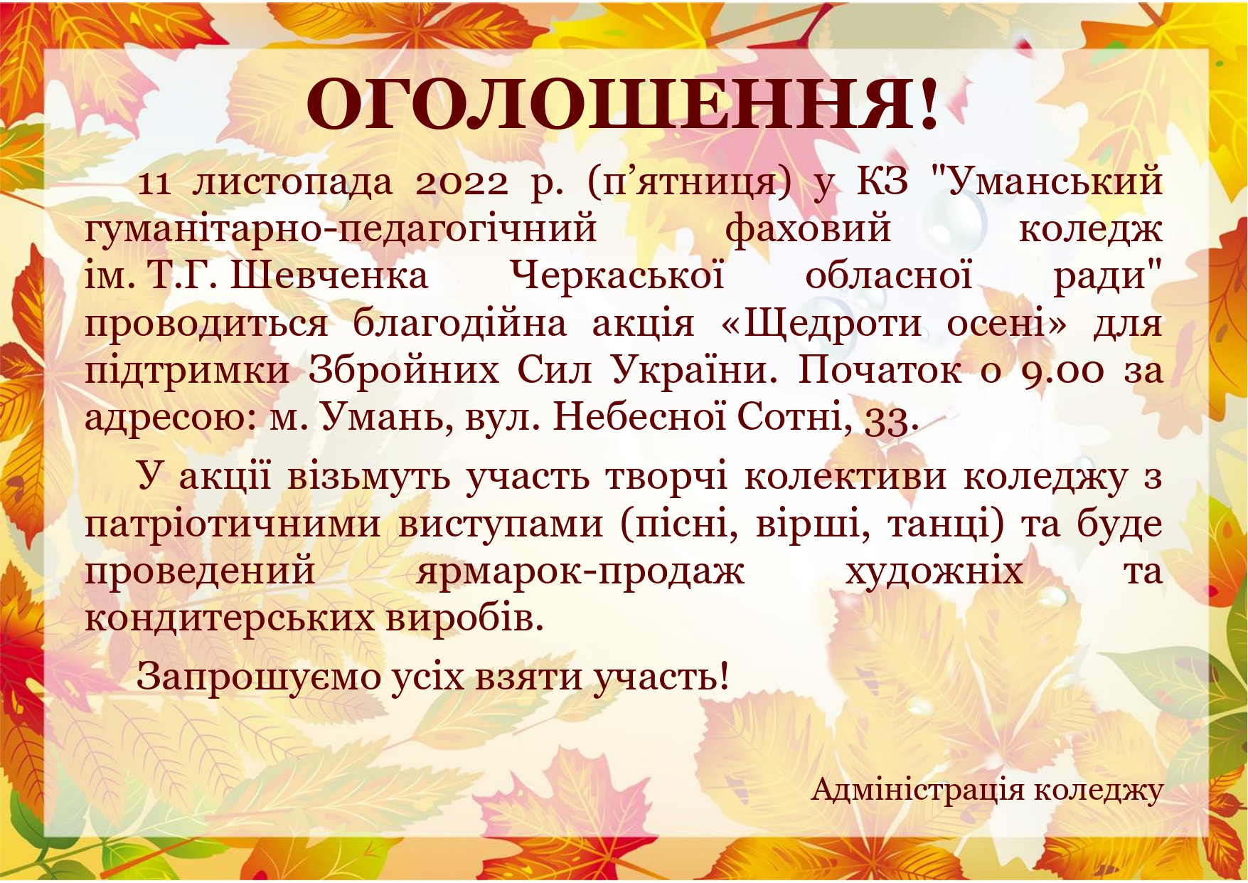 КЗ «Уманський гуманітарно-педагогічний фаховий коледж ім. Т. Г. Шевченка Черкаської обласної ради» 10-11 листопада 2022 року проводить VII Всеукраїнську науково-практичну конференцію з міжнародною участю «Я. А. Коменський - фундатор наукової педагогіки».
