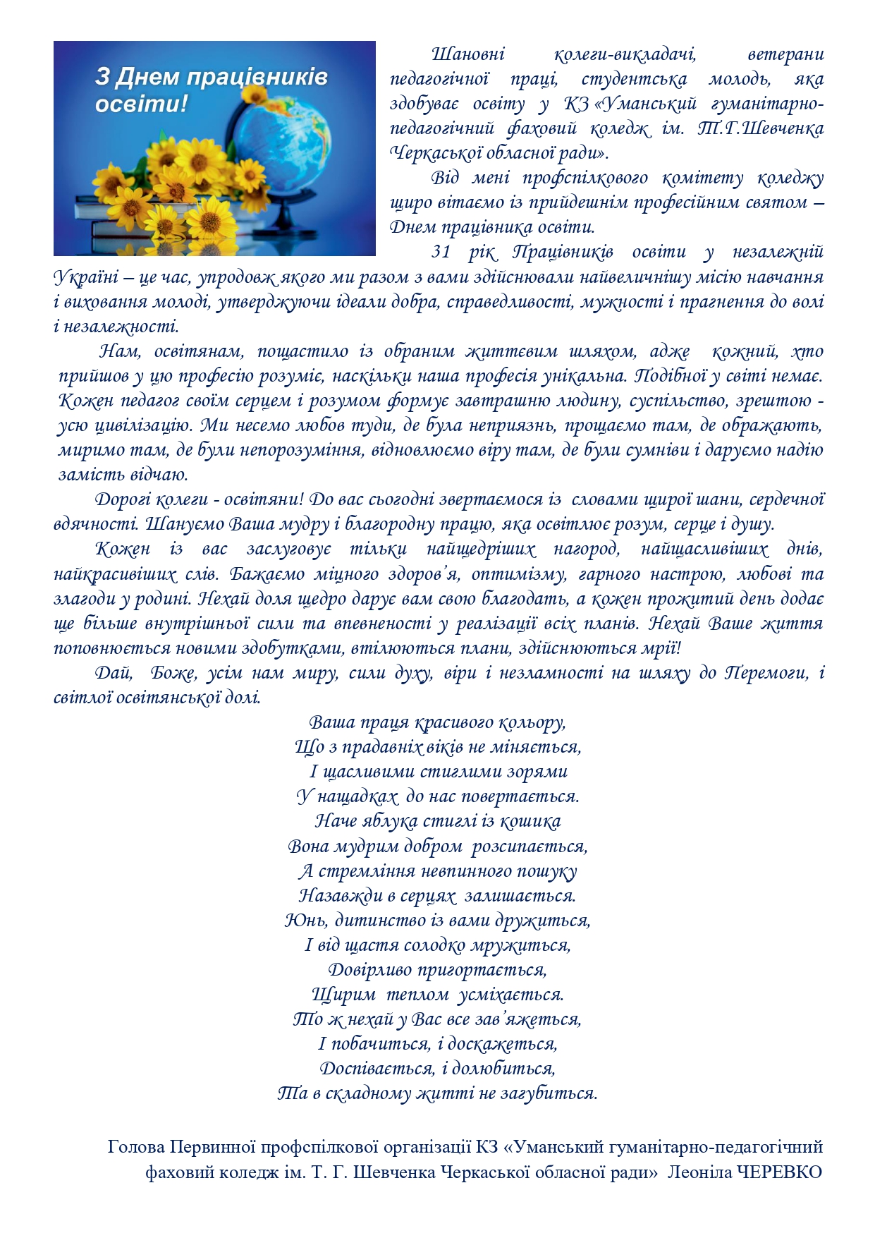 Привітання з нагоди святкування Всеукраїнського Дня бібліотек вітають здобувачі освіти 304-ПМ групи (класний керівник Марина Кайкова) відділень дошкільної і початкової освіти спеціальності 013 Початкова освіта, 014 Середня освіта (Музичне мистецтво) КЗ «Уманський гуманітарно-педагогічний фаховий коледж ім. Т. Г. Шевченка Черкаської обласної ради».