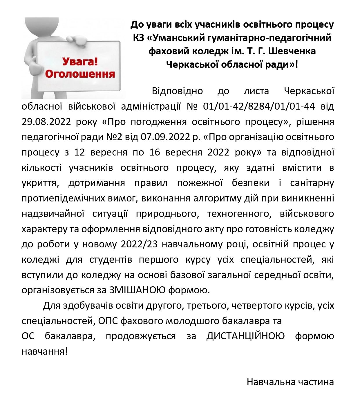 Постановою Кабінету Міністрів України «Про особливості акредитації освітніх програм, за якими здійснюють підготовку здобувачі вищої освіти, в умовах воєнного стану» від 16 березня 2022 р. № 295 установлено, що строк дії сертифікатів закладів вищої освіти (наукових установ) про акредитацію спеціальностей і напрямів підготовки та сертифікатів про акредитацію освітніх програм, за якими здійснюється підготовка здобувачів вищої освіти, що були чинними на 24 лютого 2022 року, продовжується до 1 липня року, наступного за роком припинення або скасування воєнного стану в Україні.