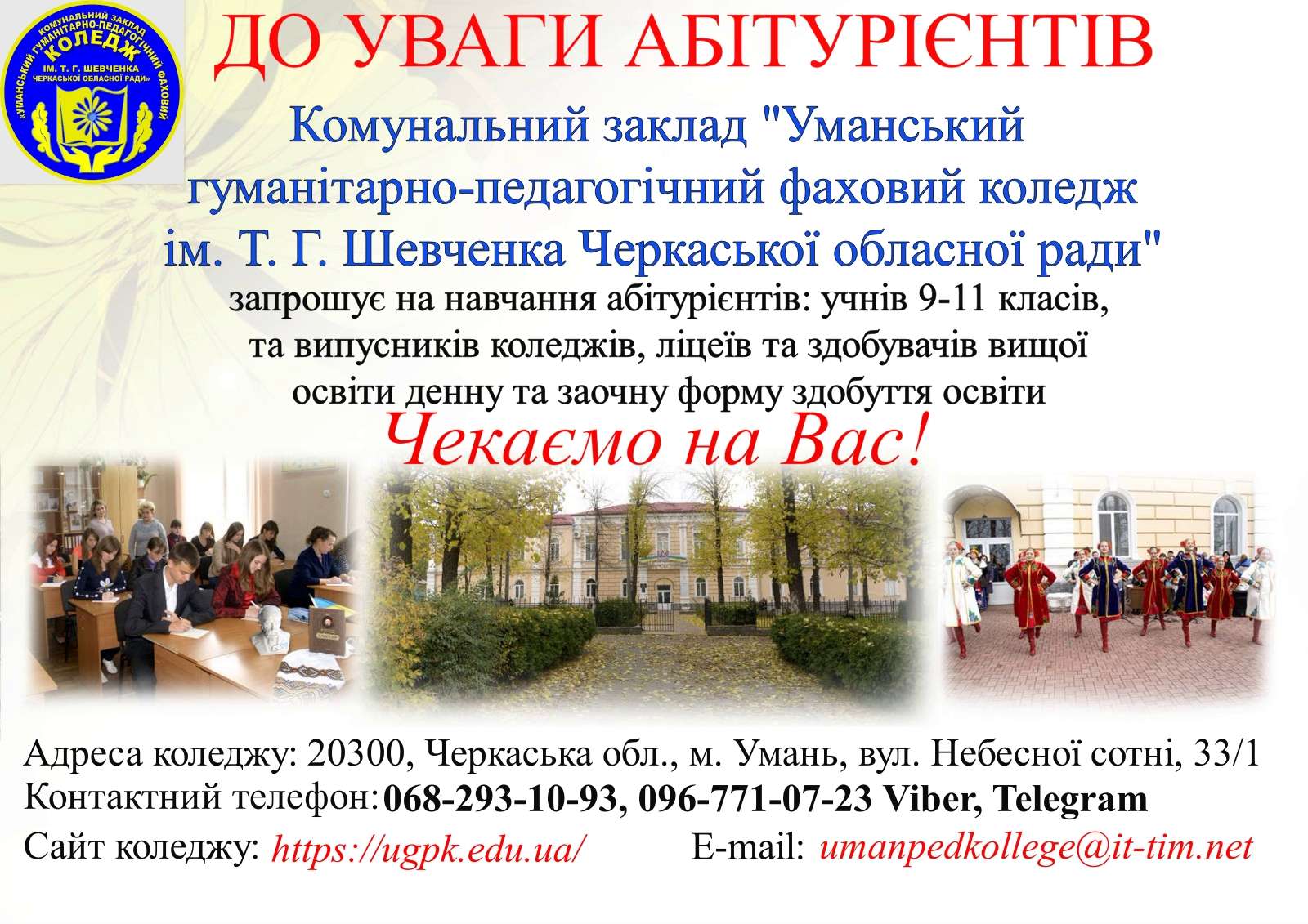 РОБОТА ПРИЙМАЛЬНОЇ КОМІСІЇ КЗ «Уманський гуманітарно-педагогічний коледж ім. Т.Г.Шевченка Черкаської обласної ради» ТРИВАЄ.