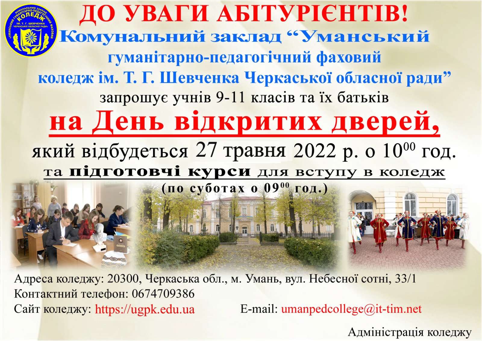 День відкритих дверей — це традиційний захід, у межах якого вступники мають змогу отримати необхідну інформацію про навчання в коледжі та зробити перший крок до своєї освіти в комунальному закладі «Уманський гуманітарно-педагогічний фаховий коледж ім. Т. Г. Шевченка Черкаської обласної ради». Детальніше